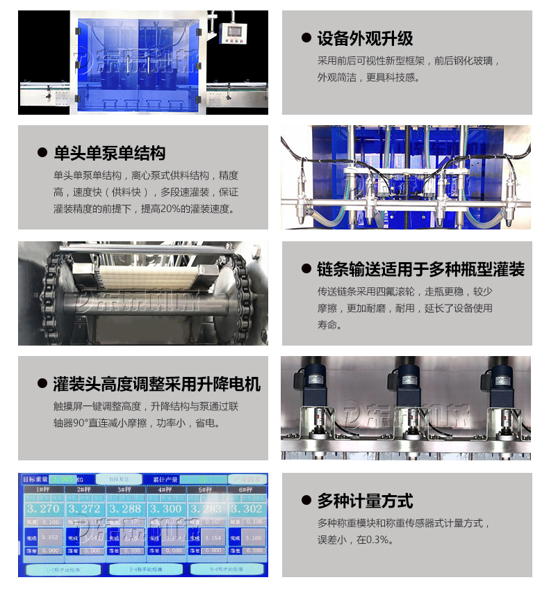 8、每個灌裝頭均有稱重和反饋系統,可對每個頭的灌裝量進行設置和微量調整。