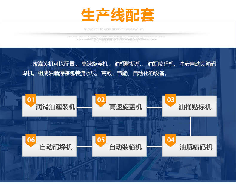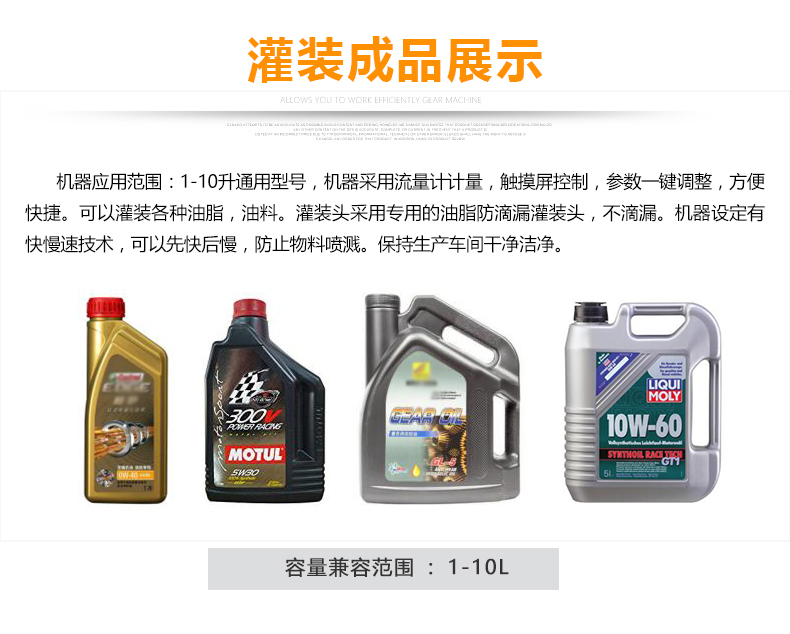 該大型潤滑油灌裝機采用容積式計量灌裝原理,適用于各種規格(1-5L)的液體肥等液體灌裝。設備采用伺服驅動活塞計量,保證了 1‰的灌裝,在保證灌裝的同時,提高了 20%-35%的灌裝速度,操作簡單,維護方便,節省人工成本,生產效率更高。