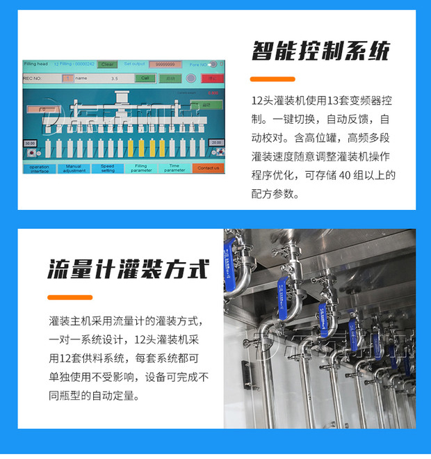 1.智能控制系統,12頭灌裝機使用13套變頻器控制。一鍵切換,自動反饋,自動校對。