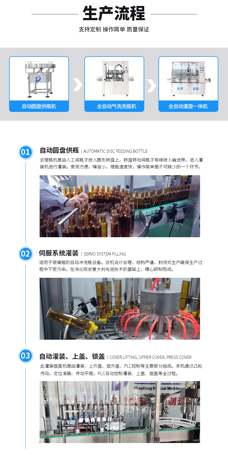 此橄欖油灌裝旋蓋機生產(chǎn)線是由灌裝、上外蓋、旋外蓋、PLC控制等主要部分組成。本機通過凸輪傳動,定位準(zhǔn)確,傳動平穩(wěn),PLC自動控制灌裝、上蓋、旋蓋等全過程。并可配置全自動注塑機,由吹瓶直接進入灌裝系統(tǒng),防止交叉感染,整個過程全部在無菌條件下完成,無需洗瓶和烘干。此灌裝旋蓋機適合于食用油、藥品等粘流體的灌裝生產(chǎn)。