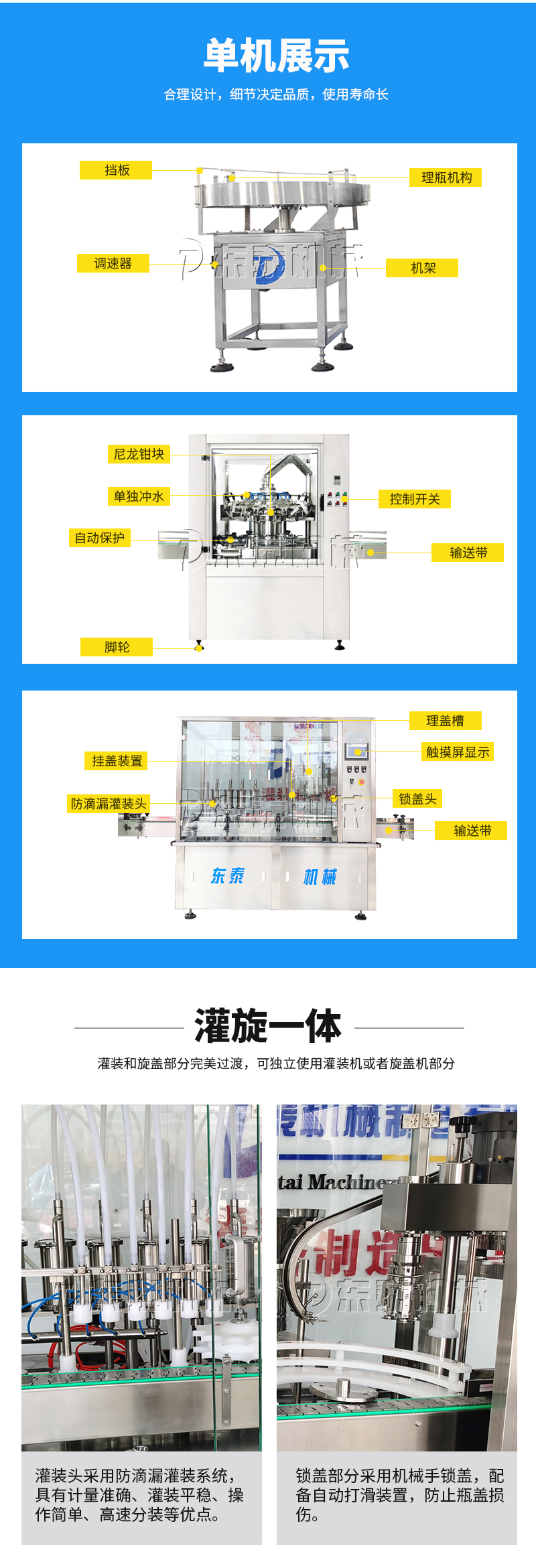 1、本橄欖油灌裝旋蓋機生產(chǎn)線采用機械手旋蓋,配備自動打滑裝置,防止瓶蓋損傷。